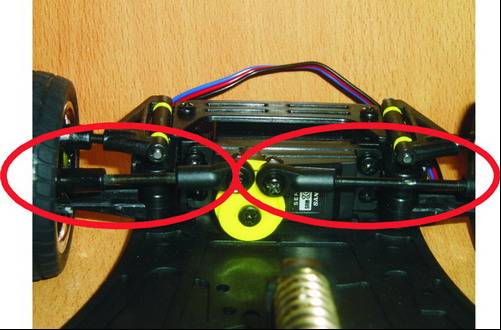 前輪是由舵機(jī)帶動(dòng)左右橫拉桿實(shí)現(xiàn)轉(zhuǎn)向的。主銷(xiāo)在垂直方向的位置確定后,改變左右橫拉桿的長(zhǎng)度即可改變前輪前束的大小。左桿短,可調(diào)范圍為10.8mm~18.1mm;右桿長(zhǎng),可調(diào)范圍為29.2mm~37.6mm(如圖1紅圈所示)。