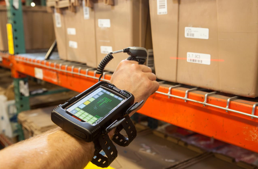 倉庫工作人員使用霍尼韋爾指環掃描器掃描貨物條碼
