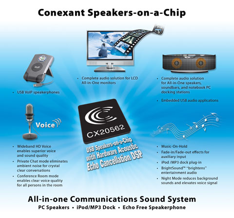 CX20562 在一個器件中集成了關鍵的揚聲器技術和處理功能,面向支持高清音頻和語音應用的產品。該器件符合 USB 音頻類規范,并支持基本的音頻接口,包括輔助輸入、耳機插孔、內置麥克風輸入、數字/模擬音量控制、揚聲器靜音和麥克風靜音。其技術創新包括:
