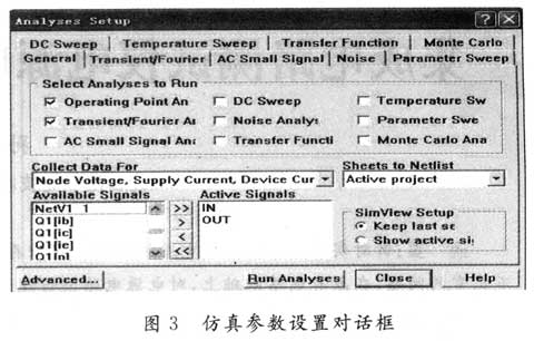 首先進行仿真參數(shù)設置,進行瞬態(tài)分析與傅里葉分析,仿真參數(shù)設置對話框如圖3所示。