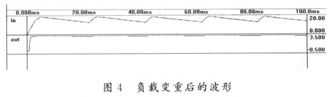 用Protell 99 Advanced SIM 99對圖1所示電路進行仿真,發(fā)現(xiàn)當負載變重,超過78M05較大輸出電流(0.7 A)時,將使輸出電壓的紋波增大,輸出電壓(out)下降且不穩(wěn)定,out波形有明顯的波動,5 V下降為4 V左右,且輸出(out)波形不平滑,紋波大。負載變重后的仿真波形如圖4所示。