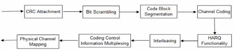 下行用戶數(shù)據(jù)在MAC層是承載在傳輸信道DL-SCH上的。當(dāng)基站發(fā)射數(shù)據(jù)的天線多于一根時(shí),MAC層會(huì)將接收到的上層數(shù)據(jù)分成兩個(gè)比特流。圖1-2是傳輸信道DL-SCH在MAC層的一個(gè)比特流的處理流程[2]。每一個(gè)比特流需要被附加24比特的CRC校驗(yàn)位,然后再進(jìn)行比特加擾。如果比特流的大小大于傳輸信道的較大長(zhǎng)度,比特流就會(huì)被分割成多個(gè)碼塊,每一碼塊都要加24比特的CRC校驗(yàn)位。經(jīng)過(guò)碼塊分割后,每一個(gè)碼塊都要進(jìn)行信道編碼。DL-SCH傳輸信道使用的是Turbo1/3編碼方式。編碼后的數(shù)據(jù)進(jìn)入HARQ軟比特緩沖器后,進(jìn)行HARQ的功能處理。從HARQ軟比特緩沖器輸出的比特流進(jìn)行二次交織后,與控制信息復(fù)用,然后再映射到物理信道上。