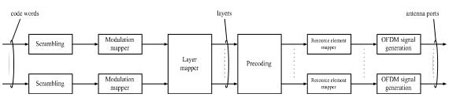 圖1-3是物理信道PDSCH上兩個(gè)碼字的處理流程[3]。首先,將傳輸信道DL-SCH上的碼字進(jìn)行加擾,然后再進(jìn)行調(diào)制。PDSCH的調(diào)制方式可以是QPSK、16QAM或64QAM。經(jīng)過(guò)調(diào)制后的碼字是復(fù)值的調(diào)制符號(hào),這些符號(hào)又會(huì)映射在一個(gè)或者多個(gè)的空間層上。在LTE系統(tǒng)中,空間復(fù)用可以有1、2、3或4層。每一層的復(fù)值信號(hào)經(jīng)過(guò)預(yù)編碼后映射在為這個(gè)PDSCH分配的資源單元上,然后再經(jīng)過(guò)OFDM調(diào)制,被發(fā)送到天線端口上。