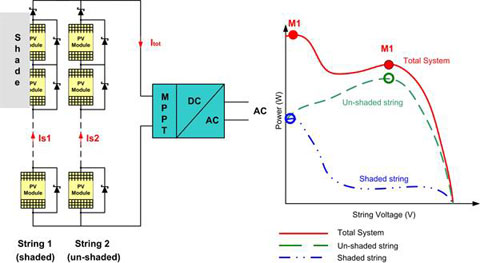 當光伏陣列受到遮蔽而出現上述情況時,會產生一條具有多個峰值的 V-P 電氣曲線。圖 1 顯示了具有集中式較大功率點跟蹤系統( MPPT) 功能的標準并網配置,其中一個組列的兩個電池板被遮蔽。集中式 MPPT無法設置直流電壓,因此無法令兩個組列的輸出功率都達到較大。在高直流電壓點 (M1),MPPT 使未遮蔽組列的輸出功率達到較大。在低直流電壓點 (M2),MPPT 將使遮蔽組列的輸出功率達到較大:旁路二極管繞過遮蔽電池板,此組列的未遮蔽電池板將提供全量電流。陣列的多個 MPP 可能導致集中較大功率點跟蹤(MPPT)配置的額外損失,因為較大功率點跟蹤器可能得到錯誤信息停止在局部較大點處,并穩定在具有V-P特征的次優點。