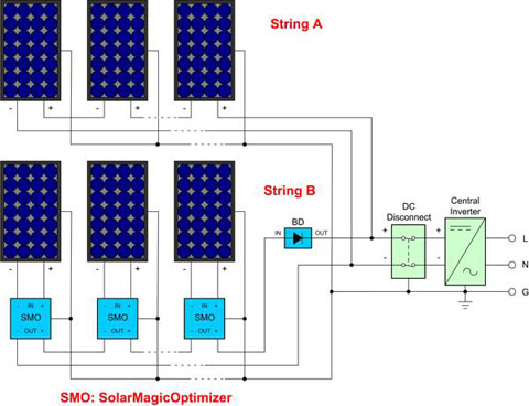 SolarMagic™ 優化器模塊具有高效集成的電源電路,采用較大限度提高各光伏模塊輸出功率的較大功率點算法。因此,整個組列具有相同的輸出電流,極大減少了熱斑問題和采用內部旁路模式。每個 SMO 模塊將調節其輸出電壓以符合整體的總線電壓。