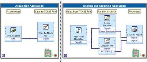 圖1. 使用LabVIEW的數據流編程,在線分析和報告與數據采集集成在一起。