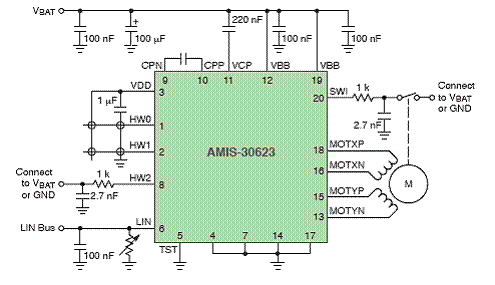 安森美半導體的AMIS-30623單芯片雙極步進電機驅動器適用于前照燈的水平調整和旋轉控制。該器件帶有集成的位置控制器和本地互聯網絡(LIN)接口,可實現與LIN主機遠程連接的專用機電一體化解決方案設計,見圖3。它利用電流、速度、加速度和減速度等可配置參數,通過總線接收位置指令,并驅動電機線圈到所需的位置。AMIS-30623還可以檢測電機停轉。