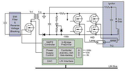 HID燈的問世改善了前照燈系統的性能。相對于傳統鹵素燈,HID改善了顯色性,具備低功耗、更長使用壽命和更高光輸出的特點。為了支持先進的功能,HID前照燈需要高效率的鎮流器和復雜的控制電路。