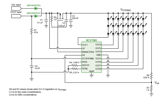 NCV7680集成了眾多功能,支持兩個亮度等級,一級用于停車,另一級用于尾部照明。如果需要,也可使用可選的脈寬調制(PWM)控制。系統設計人員只需使用一個外部電阻設定輸出電流(整體設定點)。另外,針對要求大電流的設計,可選的外部鎮流器場效應晶體管(FET)可以根據設計所需的高電流進行功率分配。延遲的功率極限降低了在過電壓狀態下的驅動電流。這對于沒有外部FET的低電流應用來說十分重要。