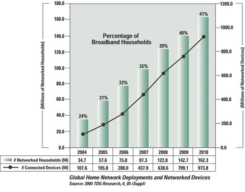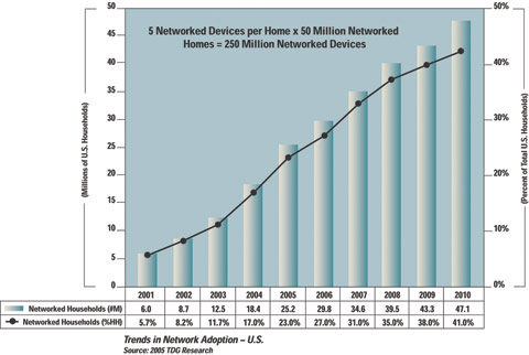 據 TDG 調研公司統計,在美國,每戶家庭通常擁有 5 臺聯網設備,到 2010 年,聯網家庭將達 5 千萬戶,屆時家用聯網設備將達 2.5 億臺以上。而到2010年,全球聯網家庭將達1.62億戶,家庭聯網設備將超過9.73億臺。