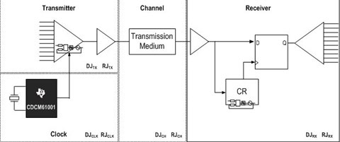 圖 1 顯示了集成有一個嵌入式時鐘的典型高速通信鏈路。每個子系統(tǒng)(時鐘、發(fā)送器、通道和接收機)都會對整體抖動預(yù)算的增加產(chǎn)生影響。子系統(tǒng)抖動包括一個決定性 (DJ) 組件和一個隨機組件 (RJ),如圖 1 所示。為了實現(xiàn)可接受的通信效果,必須滿足下列條件: