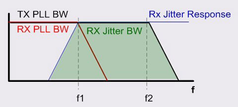 總抖動 (TJ) 包括每個子系統(tǒng)決定性抖動和隨機抖動的和。由于隨機抖動自身的屬性,進行這種求和時需要特別注意。隨機抖動呈現(xiàn)高斯(隨機)分布,并且無邊界。因此,隨機抖動可表示為一個 RMS 值,并且在規(guī)定測量/整合帶寬范圍內(nèi)對其進行估算。例如,圖 1 所示接收機的抖動測量帶寬便為 f2 - f1(參見圖 2)。這是因為接收機鎖相環(huán)路 (PLL) 追蹤 f1 以下的抖動(從而排斥它),而發(fā)射 PLL 的頻率上限為 f2。從接收機的角度來看,使鏈路性能降低的隨機抖動降至這些限制之間。