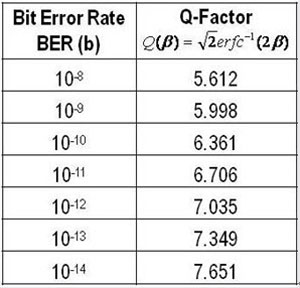 較后,可對系統(tǒng)總抖動進行估算,由此可以實現(xiàn)鏈路預(yù)算;但是,還需要做更多的工作。這種計算涉及統(tǒng)計數(shù)學(xué)。需要用到一種被稱之為 Q 因數(shù)的參數(shù)(參見表 1)。Q 因數(shù)的大小具體取決于誤碼率 (BER),同時還要根據(jù)鏈路性能/可靠性目標來選擇。由于隨機抖動的無邊界屬性,(較終)會出現(xiàn)誤碼。例如,10-8 的 BER 意味著,每發(fā)送 100,000,000 比特便會有一個比特被錯誤解釋。現(xiàn)代的通信系統(tǒng)通常會要求一個達到或者超過 10-12 以上的 BER。