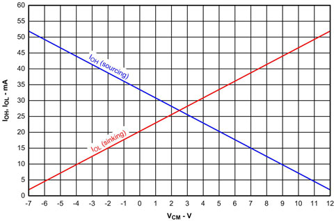 圖 3 顯示了在規定共模電壓范圍,驅動 RCM = 375 Ω 較大共模負載 (32 UL) 的一個 5V 收發器的較小輸出電流要求。用于繪制該圖的參數假設為 VOS = 2.5 V、VOD = 1.5 V、RD = 60 Ω 和 RCM = 375 Ω。