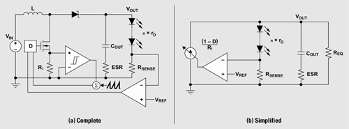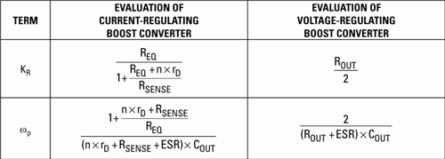 計(jì)算兩種電路的負(fù)載周期 D 以及 VOUT 與 REQ 的修改值所使用的方式都相同。Sn 及 Se 分別是升壓轉(zhuǎn)換器的自然形成電感斜率與補(bǔ)償斜率,而 fSW 是切換頻率。關(guān)于電壓調(diào)節(jié)升壓轉(zhuǎn)換器的小信號(hào)模型與電流調(diào)節(jié)升壓轉(zhuǎn)換器的模型,兩者之間真正的差異來自乘以跨導(dǎo)用項(xiàng) (1 – D)/Ri 的抗阻 KR 以及主要電極 wp。這些差異已在表 1 予以概述。詳細(xì)信息請(qǐng)見參照 1。由于在調(diào)節(jié)電壓的轉(zhuǎn)換器中, RSENSE 值一般遠(yuǎn)低于 ROUT 值,因此,電流調(diào)節(jié)轉(zhuǎn)換器的增益 (其中 ROUT = REQ) 幾乎都低于電壓調(diào)節(jié)轉(zhuǎn)換器的增益。