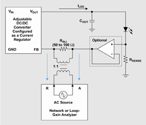 在電流調(diào)節(jié)配置中,如果負(fù)載本身是上端 FB 電阻,則無法通過與 LED 串聯(lián)的方式將注入電阻插入。轉(zhuǎn)換器的運(yùn)作點(diǎn)必須先予以變更,才能將電阻插入于FB 引腳與感應(yīng)電阻之間,如圖 6 所示。在某些情況下,可能需要非反向單位增益緩沖放大器,以降低注入點(diǎn)的阻抗,并減少測(cè)量噪聲。