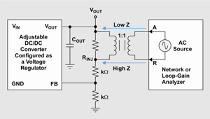 若要測(cè)量控制回路增益與電壓調(diào)節(jié)轉(zhuǎn)換器的相位,網(wǎng)絡(luò)或?qū)S没芈吩鲆?相位分析儀一般會(huì)使用 1:1 變壓器將小信號(hào)通過小阻抗 (RINJ) 注入回路中。然后,分析儀便會(huì)根據(jù)頻率測(cè)量并比較 A 點(diǎn)的注入信號(hào)與 R 點(diǎn)的回傳信號(hào),之后,報(bào)告幅度差異 (增益) 與時(shí)間延遲 (相位) 的比例。只要 A 點(diǎn)的阻抗遠(yuǎn)低于 R 點(diǎn)的阻抗,即可在回路中的任一處插入此阻抗,否則注入的信號(hào)會(huì)過大,因而干擾轉(zhuǎn)換器的運(yùn)作點(diǎn)。如圖 5 所示,高阻抗節(jié)點(diǎn)是一般插入此阻抗的位置,也是 FB 電阻在輸出電容 (低阻抗節(jié)點(diǎn)) 偵測(cè)輸出電壓的地方。