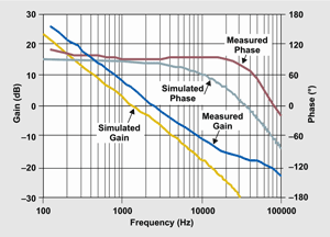 用來測(cè)量回路的是Venable回路分析儀,它與圖 6 中的測(cè)量設(shè)定相同但不含放大器,而且 RINJ = 51.1 W。電流調(diào)節(jié)轉(zhuǎn)換器的模型是以 Mathcad? 構(gòu)建,并且使用 TPS61170 的數(shù)據(jù)表設(shè)計(jì)參數(shù),其中的核心與 TPS61165 相同。當(dāng) VIN = 5 V 且 ILED 經(jīng)設(shè)定為 350 mA 時(shí),該模型會(huì)產(chǎn)生 TPS61165EVM 的預(yù)期回路響應(yīng),如圖 7 所示,可便于與測(cè)得的數(shù)據(jù)進(jìn)行比較。