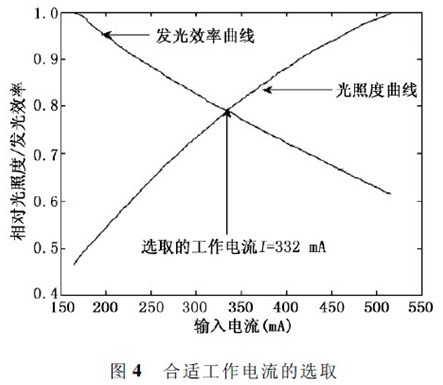 綜合考慮上述兩種情況,即兼顧光照度以及發光效率,選取合適的驅動電流I,從而使LED 照明光源同時滿足足夠的亮度和相當高的發光效率。方法如下,橫坐標依舊選擇輸入電流值,而縱軸分別進行歸一化處理,作出兩條曲線,而曲線的交點對應的電流值即為所要選取的合適工作電流值,此處I = 332mA,如圖4 所示。