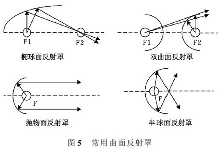 首先,對于LED 而言,增大其光出射角度可以組合使用反射罩和透鏡,常用的反射罩形狀有拋物面、橢球面、雙曲面、半球面等,其反射原理如圖5 所示。
