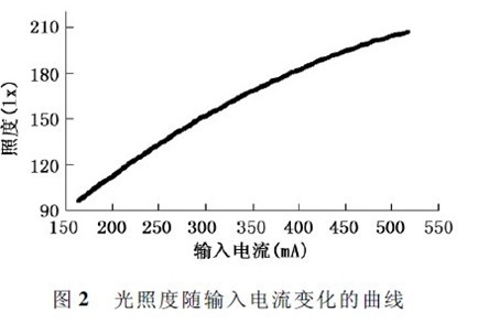 在恒流輸入的工作環境下,將1W 級大功率LED芯片放在暗箱中,線性改變輸入電流,用照度計測出光照度與輸入電流的變化關系,繪出如圖2 所示的關系曲線,光照度隨著電流的上升基本呈現線性增長的趨勢。