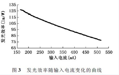 計算在相應電流下的輸入電功率P = UI,測出光通量Ф,則可計算出各組的發光效率η = Ф /P。繪出發光效率隨輸入電流的變化曲線如圖3 所示,在輸入電流穩定上升時,1W 級大功率LED 芯片的發光效率是呈下降趨勢的。