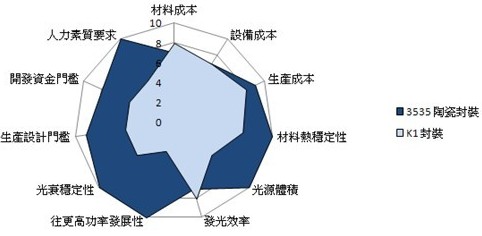 圖一 K1與3535陶瓷基板封裝產品之綜合比較