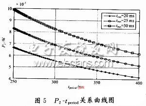 由圖4可見,影響開關節點功率大小的因素有運行時間trun和開關次數n。其中,trun與通信過程有關,控制信息的目標節點越多,trun越大;而開關次數n則由使用習慣決定,平均功率隨開關的頻繁程度增加而增大。若某開關信息需要同時控制2個照明節點(trun=30 ms),每天開關20次,平均功率約為0.5 mW;控制3個節點,每天開關10次,其平均功率則為0.31 mW。如圖5所示,照明節點的平均功率由運行時間trun和喚醒周期tperiod決定。其中,trun與電路設計和執行器件有關;喚醒周期與網絡響應速度有關,tperiod越大,網絡的響應時間就越長。在照明的控制中,對系統的實時性要求不大,同時考慮到節能和用戶操作的要求,喚醒周期取值在250~400 ms之間,照明節點的功率可控制在10mW以下。