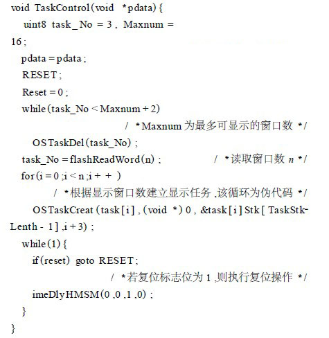 窗口顯示任務根據各窗口顯示方式的不同,在其對應的part存儲區域進行下一幀數據的處理運算,然后調用窗口顯示子任務進行顯示。在完成一幀數據的顯示后,調用一次OSTimeDlyHMSM()使當前任務進入等待狀態,下一個優先級較高并進入了就緒態的任務,立刻被賦予了CPU的控制權,由此完成窗口顯示任務之間的切換。任務TaskControl()定期查詢Reset是否有效,若有效則刪除原來建立的任務,重新讀取窗口數,建立新任務,啟用各個窗口顯示任務Task_i。