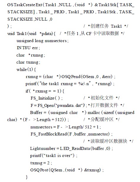 控制系統軟件是基于實時操作系統μC/OS2II進行設計的。該操作系統利用高效任務調度算法調度每個任務,而每個窗口的顯示由單個任務完成。主函數創建了2個任務:一個用于讀取CF卡數據;另一個用于接收來自不同顯示模塊的場景數據和播放顯示文件。