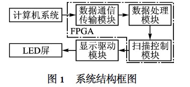 LED顯示系統主要由計算機系統、數據通信傳輸模塊、數據處理模塊、掃描控制模塊、顯示驅動模塊和LED屏構成,如圖1所示。計算機系統將要顯示的點陣信息通過RS485串行接口送往存儲設備,數據處理模塊讀取存儲設備的數據并進行各種特技顯示處理,將處理好的數據送往掃描控制模塊,顯示驅動模塊接收到掃描控制模塊的數據后送往LED屏上顯示。數據通信傳輸模塊、數據處理模塊、掃描控制模塊3部分均在FPGA上實現,即構成LED異步控制器。