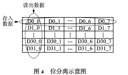 所謂位分離,就是把數據的高低位按權重分開,然后重新組織。位分離在可編程邏輯器件中比較容易實現,可以劃出一塊邏輯矩陣,操作時橫向存入,縱向讀出即可。位分離示意圖如圖4所示。