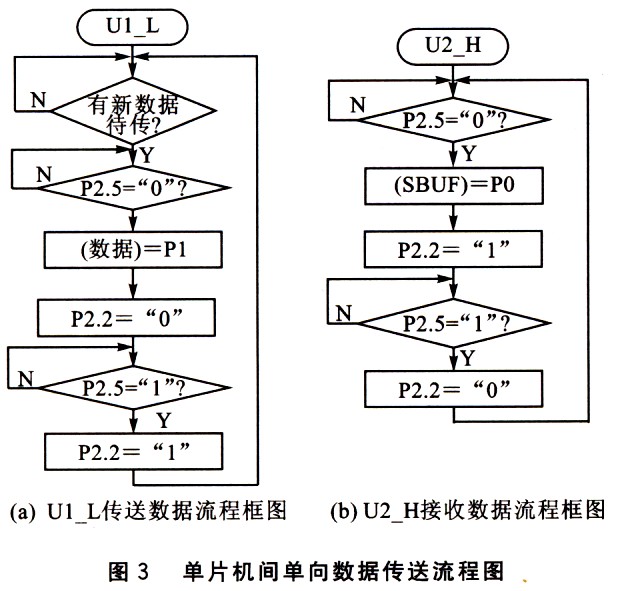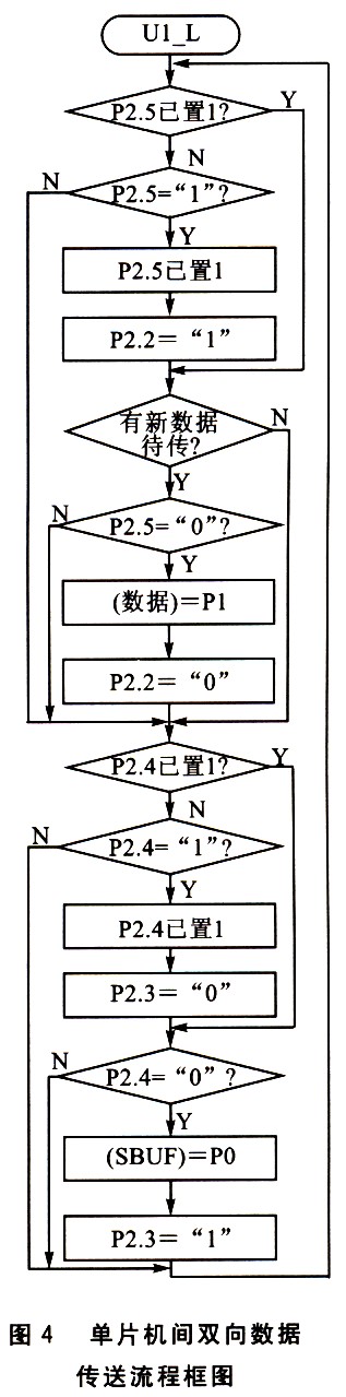 單向傳送就是通信口的數(shù)據(jù)流只向一個(gè)方向,即從Ul_L接收到的數(shù)據(jù),從U2_H發(fā)送出去,或從U2_H接收到的數(shù)據(jù),從Ul_L發(fā)送出去。用這種方式進(jìn)行軟件編程比較簡(jiǎn)單。現(xiàn)以U1_L只接收外部設(shè)備數(shù)據(jù),U2_H只向外部設(shè)備發(fā)送數(shù)據(jù),采用查詢方式為例,兩單片機(jī)之間數(shù)據(jù)傳送的流程圖如圖3所示。其中 Ul_L的P2.2作為向U2_H傳送新數(shù)據(jù)的查詢信號(hào)(U2_H的P2.5),P2.2=“0”表示有新的數(shù)據(jù),P2.2=“1”表示沒(méi)有新的數(shù)據(jù); U2_H的P2.2作為接收U1_L數(shù)據(jù)的查詢信號(hào)(U1_L的P2.5),P2.2=“O”表示可以接收新的數(shù)據(jù),P2.2=“1”表示不能接收新的數(shù)據(jù)。如果采用中斷方式,兩單片機(jī)的查詢信號(hào)更簡(jiǎn)單,只要Ul_L查詢U2_H是否可以接收數(shù)據(jù)的信號(hào)就可以,U2_H無(wú)需查詢U1_L的查詢信號(hào)。