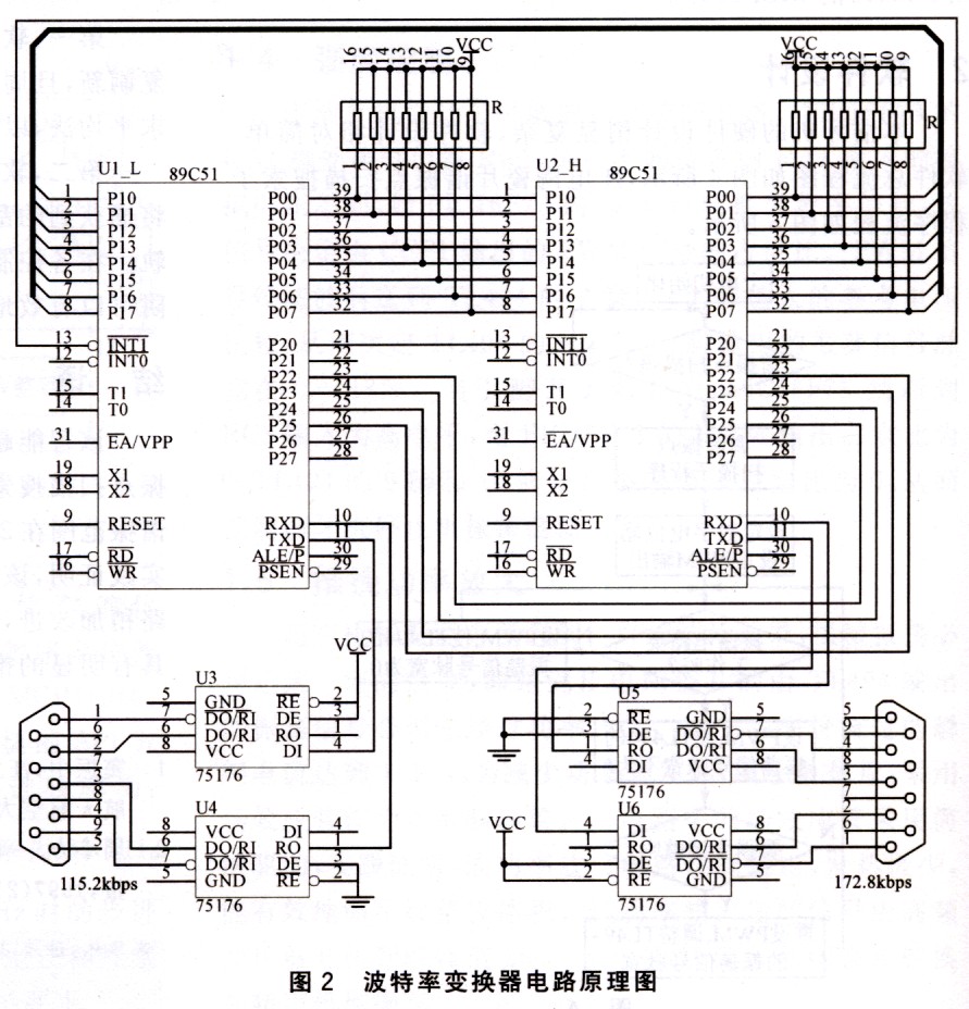 波特率變換電路如圖2所示。電路采用2片單片機(jī)89C5l作為電路的核心,利用單片機(jī)的UART串行口與相關(guān)設(shè)備通信。單片機(jī)u1_L.(接波特率低的設(shè)備)與波特率為115.2 kbps的設(shè)備通信,單片機(jī)U2_H(接波特率高的設(shè)備)與波特率為172.8 kbps的設(shè)備通信。Ul_I,與U2_H的通信采用并行口方式,以加快Ul_I。與U2_H之間數(shù)據(jù)傳遞的速率。U1_L與U2_H的通信可以采用中斷查詢的方式,也可以采用握手查詢的方式進(jìn)行數(shù)據(jù)傳遞。