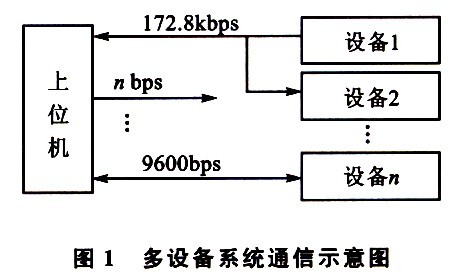在一些復(fù)雜的系統(tǒng)中,系統(tǒng)與分系統(tǒng)、分系統(tǒng)與設(shè)備等之間存在數(shù)據(jù)的傳遞問(wèn)題,往往采用通信的方式來(lái)解決。由于分系統(tǒng)、沒(méi)備等通信波特率的不同,特別是一些特殊波特率設(shè)備的存在,使得系統(tǒng)中設(shè)備間的相互通信不易實(shí)現(xiàn)。例如,在一個(gè)系統(tǒng)中,上位機(jī)接收某一設(shè)備的數(shù)據(jù),如圖1所示,設(shè)備l和設(shè)備2采用的是 172.8 kbps的波特率,而上位機(jī)用VB編程,其通信波特率為115.2 kbps、128 kbps或256 kbps,等,這樣設(shè)備之間就不能相互通信,給設(shè)計(jì)帶來(lái)困難。為了解決上述問(wèn)題,采用雙單片機(jī)電路,設(shè)計(jì)了波特率變換器,將接收波特率為172.8 kbps的數(shù)據(jù),轉(zhuǎn)換成波特率為115.2 kbps的輸出,從而使不同波特率設(shè)備之間的通信成為可能。