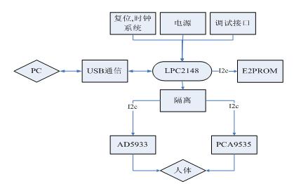 本系統采用了上下位機的設計方法[4],整個系統全部由上位機PC通過USB發送相應命令來控制,通過PC應用程序將掃查頻率起點、終點和步長設置好,通過USB接口發送到下位機,下位機解析相應的協議后,轉換成對AD5933的控制指令,配置AD5933完成相應的操作,下位機則使用了ARM7內核的LPC2148芯片作為主控制器,經I2C總線控制AD5933芯片,該芯片通過四電極法的模擬前端并使用片內DSP計算出人體的特性阻抗,主控制器通過I2C接口將其取回,數據經USB接口傳送至上位機PC作顯示和分析,較終完成對人體阻抗模值和相位的掃頻測量。同時系統在人體和PC之間采用了安全隔離措施,保證了測試人體的安全。本設計中為了方便校準測量,使用了I2C總線接口的E2PROM存儲校準所獲得的參數,另外本設計利用PCA9535芯片將I2C信號轉為I/O信號作為控制位控制選取測量所需要的前端電極,這樣就可以同時測量人體多個區間段的阻抗信息[5]。