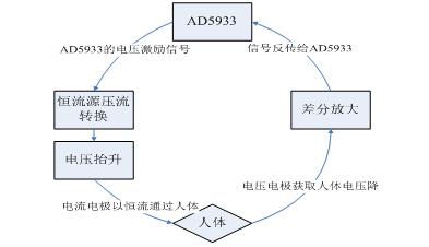 采用了四電極法[6],即采用一對激勵電極提供激勵電流,以及一對電極測量人體上的電壓降。激勵電極采用了壓流轉換設計,將AD5933所發出的激勵電壓信號轉換為交流恒流信號,經過電平抬升至2.5V的多頻率恒流經過人體[7],測量電極所測得的在人體上產生的電壓通過高輸入阻抗和高共模抑制比的差分放大器,送至后端作AD轉換處理和阻抗特性計算,保證測量的準確性。與比較簡單的兩電極法相比具有更好的精確程度,整個測量電極模擬前端如圖2所示。