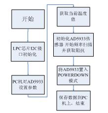 該部分軟件的主要是控制AD5933進行頻率掃描并獲取阻抗,測量溫度等。AD5933的初始化設置參數由PC主機應用程序通過USB接口傳遞至下位機,下位機解析指令再通過I2C接口寫入AD5933片內寄存器。