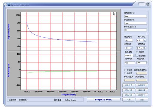 上述測量結果包含了兩個測量結果,上面的曲線代表了人體阻抗模值隨頻率變化的情況,下面的曲線代表了人體阻抗相位隨頻率變化的情況,實驗中頻率變化的范圍取為5KHz-100KHz,步進頻率設為在1KHz。由圖中可以發現出人體左上肢+軀干+右下肢的總阻抗在850Ω(5KHz處)到400Ω(100KHz)之間,且總阻抗值隨著激勵信號頻率的升高而下降,與人體阻抗信息的常識是吻合的,實驗結果也驗證了本設計的有效性,圖形化的界面也使得本設計使用操作方便,結果一目了然。測量的阻抗信息經過算法的計算,則可以測定人體的成分組成,比如脂類成分的含量多少等等[8]。