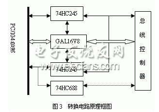 在本設計中,數據總線和地址總線分別通過兩個八總線收發送器74HC245連接到CAN控制器SJA1000的數據、地址復用總線上。74HC245是8位的總線收發送器,具有三態輸出,可以進行雙向的數據傳送。這中間用可編程邏輯芯片GAL16V8設計了一個時序控制邏輯電路,控制兩片74HC245的工作,進行時序切換,并避免數據和地址產生可能的沖突。片選信號是由一片74H688產生的,74H688是一個8位的數值比較器/等值檢測器。通過波段開關來設定I/O地址,用74HC688來比較PC/104總線上的地址信息和設定的I/O地址是否相同,如相同則對SJA1000產生片選信號。控制總線的信號切換也是由可編程邏輯芯片GAL16V8來實現的。