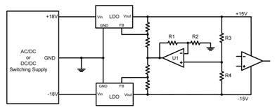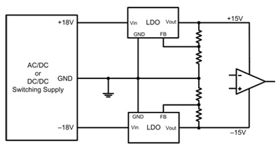 圖 2 顯示了一個典型運算放大器電源電路的示意圖。此處,一個開關電源提供一個正 18V 和一個負 18V。兩低壓降 (LDO) 線性穩壓器進一步將 ±18V 調節至 ±15V。該 LDO 一般安裝在電源和運算放大器之間,旨在降低開關電源產生的高頻開關噪聲。LDO 具有較高的電源抑制(以比率表示,PSRR),其減弱了寬帶頻率下 LDO 輸入的噪聲。
