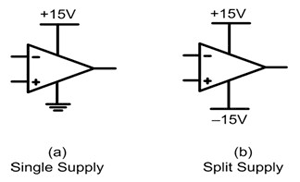 給一個運算放大器供電有兩種常見方法。第一種也是較簡單的一種方法是使用一個單一正電源,如圖 1 (a) 所示。第二種方法是使用一個分離(雙)電源(如圖1 (b) 所示),其同時具有一個正電壓和一個負電壓。這種分離電源在許多模擬電路中都非常有用,因為它允許包括零電壓電位的輸入信號或者在正與負之間搖擺的輸入信號。