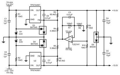 圖 5 所示電路使用一個如 TPS7A3001 等可調節、負輸出電壓 LDO 線性穩壓器,以及如 TPS7A4901 等可調節、正輸出電壓 LDO。U3、R7-R10 和 C3 均為增加的組件,用于追蹤。R1、R2、D1-D5 均為增加組件,用于將反饋引腳的電壓控制在其各自產品說明書額定的絕對較大電壓范圍內。