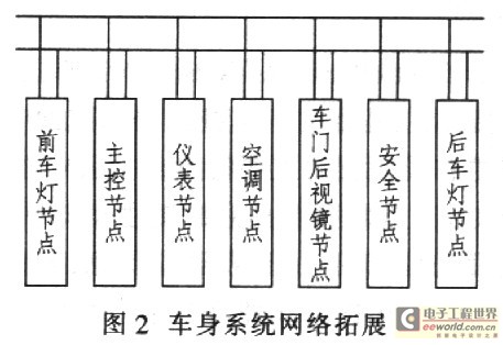 客車車身CAN系統包括主控節點、燈光節點、空調節點、車門節點和儀表節點等,如圖2所示。其中,前車燈節點控制包括前左、右示廓燈,前左、右位燈,前左、右遇險報警燈,前左、右駐車燈,左、右前照燈遠光,左、右前照燈近光,前左、右霧燈和前左、右轉向燈等16個控制單位。后車燈節點控制包括后左、右示廓燈,后左、右轉向燈,后左、右制動燈,后左、右位燈,后左、右霧燈和后左、右倒車燈等12個控制單位。主控節點主要接收來自駕駛員的一些開關輸入信號。儀表節點主要通過接收總線上的數據來控制方向、水溫、機油壓力、制動、車門、車燈、ABS/ARS和除霜等指示燈和控制儀表,以顯示車速、發動機轉速、水溫、燃油、機油、電壓、步進電機等數值。空調節點控制空調的開關和車內溫度的設定等。車門和后視鏡節點控制車門電磁閥開關、后視鏡調整開關和后視鏡加熱開關。安全節點監控ABS和ECAS的電源。