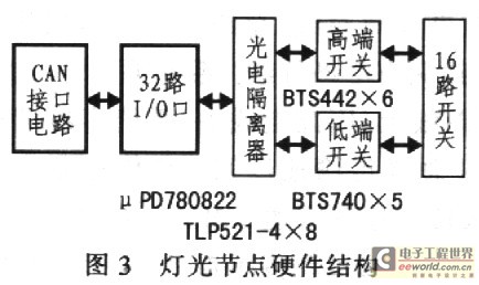 燈光節點的硬件結構如圖3所示,它包括燈光控制模塊和CAN接口模塊。燈光控制模塊由TLP521-4型光電隔離器和BTS442、BTS740型智能開關組成。