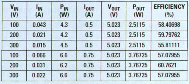 電容C4值設(shè)定大于Q4的柵極電容,但其必須足夠小,以便在更短控制器較小導(dǎo)通與斷開時間期間能夠得到再充電。圖3顯示了300V和500mA負(fù)載輸入電壓下,一個開關(guān)周期的柵極和漏極導(dǎo)通/斷開時間。表1顯示了測得的轉(zhuǎn)換效率。
