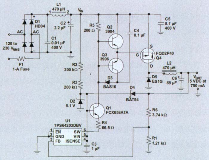 圖 1 顯示了完整的轉(zhuǎn)換器。整流器電路使用一個標(biāo)準(zhǔn)、快速開關(guān)整流器二極管橋接 (D1) 和一個LC濾波器(L1和C2),我們將對其余組件進(jìn)行更加詳細(xì)的介紹。