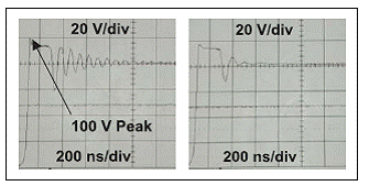 設(shè)計(jì)的實(shí)驗(yàn)驗(yàn)證是必不可少的,因?yàn)閷⒊霈F(xiàn)沒(méi)有計(jì)入公式的結(jié)果,你的電路將出現(xiàn)非理想的元件。圖3所示為箝制FET漏極電壓峰值電路的效益。