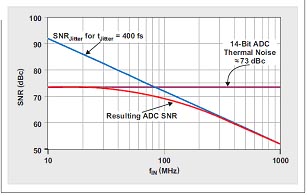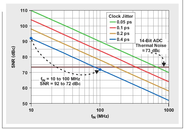 讓我們來對一個具有400 fs 抖動時鐘電路和~73 dB 熱噪聲的14 位ADC 進(jìn)行分析。低輸入頻率(例如:10MHz 等)下,該ADC 的SNR 主要由其熱噪聲定義。由于輸入頻率增加,400-fs 時鐘抖動越來越占據(jù)主導(dǎo),直到~300 MHz 時完全接管。盡管相比10MHz 的SNR,100MHz 輸入頻率下時鐘抖動帶來的SNR 每十倍頻降低20dB,但是總SNR 僅降低~3.5 dB(降至69.5dB),因?yàn)榇嬖?3-dB 熱噪聲(請參見圖5):