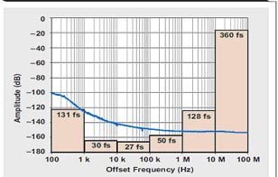 圖6 所示相位噪聲圖抖動貢獻(xiàn)量為~360 fs,其頻率偏移為10 到100MHz 之間。這比100Hz 到10MHz 之間偏移的所有~194 fs 抖動貢獻(xiàn)值要大得多。因此,所選整合上限可極大地影響計(jì)算得到的時鐘抖動,以及預(yù)計(jì)SNR匹配實(shí)際測量的好壞程度。